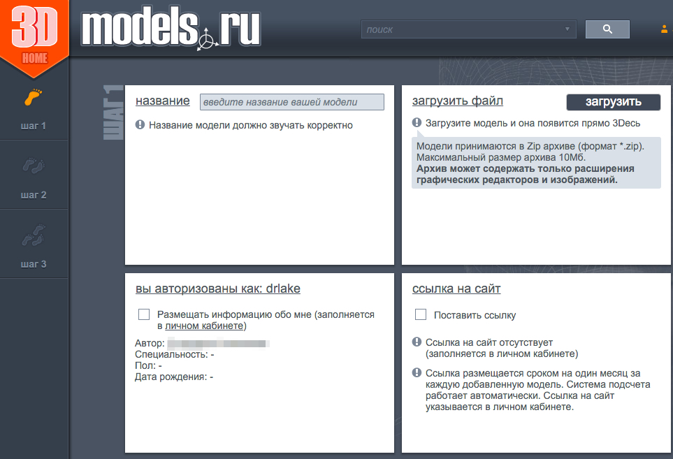 Введите наименование вашей модели, загрузите zip архив с моделью. Вы можете оставить информацию о себе и поставить ссылку на свой сайт. Эти поля не обязательно заполнять.